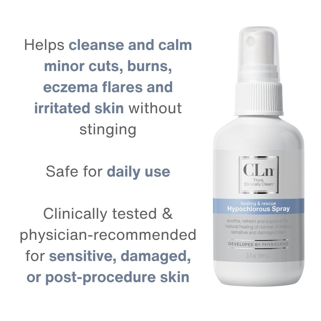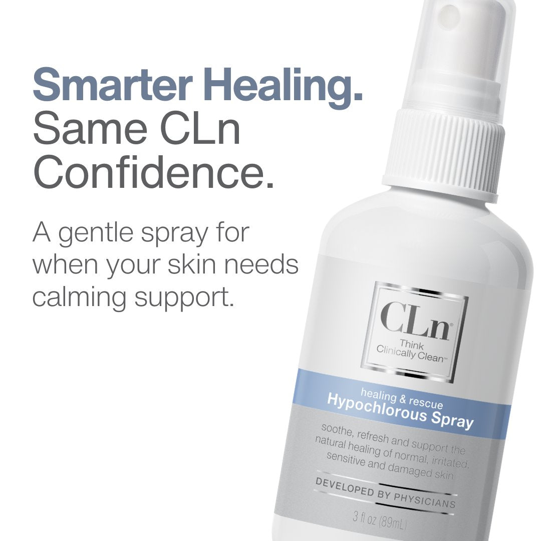 CLn Hypochlorous Spray was designed with dermatologists to deliver a safe, effective cleansing option for skin affected by minor wounds, redness, or post-procedure irritation. Hypochlorous acid is a molecule naturally produced by the body’s immune system—offers antimicrobial and soothing properties without needing alcohol, antibiotics, or steroids.
